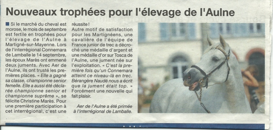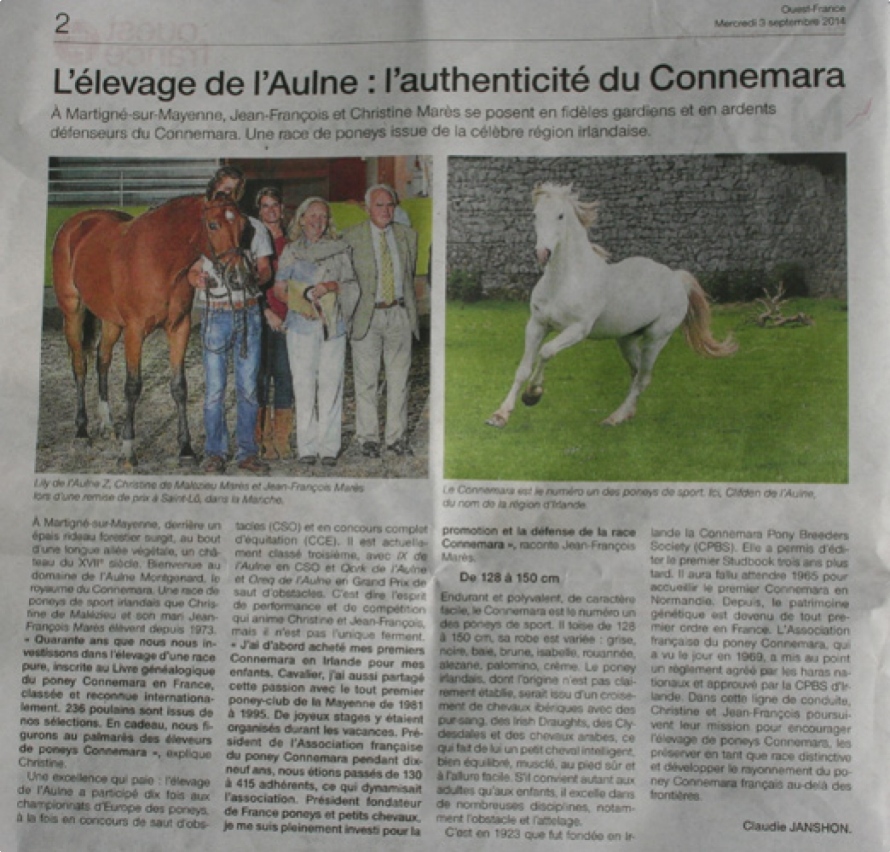 Dans le supplément Mayenne Terre de Cheval, un bel article signé Claudie Janshon, intitulé " L'élevage de l'Aulne : l'authenticité du Connemara" retrace l'histoire de notre élevage, de la race Connemara et de notre implication dans la défense et la promotion de celle ci. Merci à Claudie Janshon.