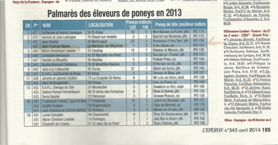 Les deux premiers du palmarès 2013 sont des éleveurs de Poney Français de Selle, nous nous retrouvons donc meilleur élevage de Connemara pour l'année 2013 en France.